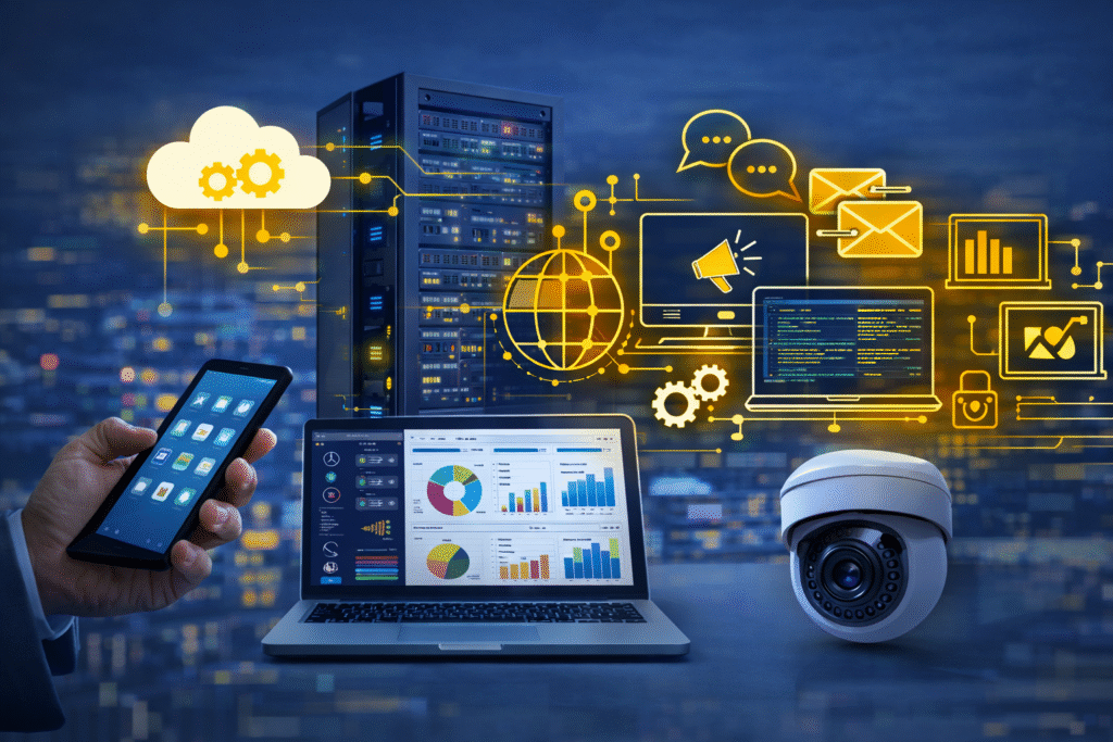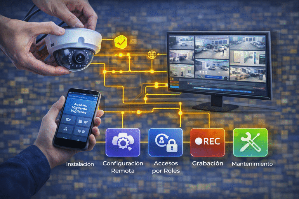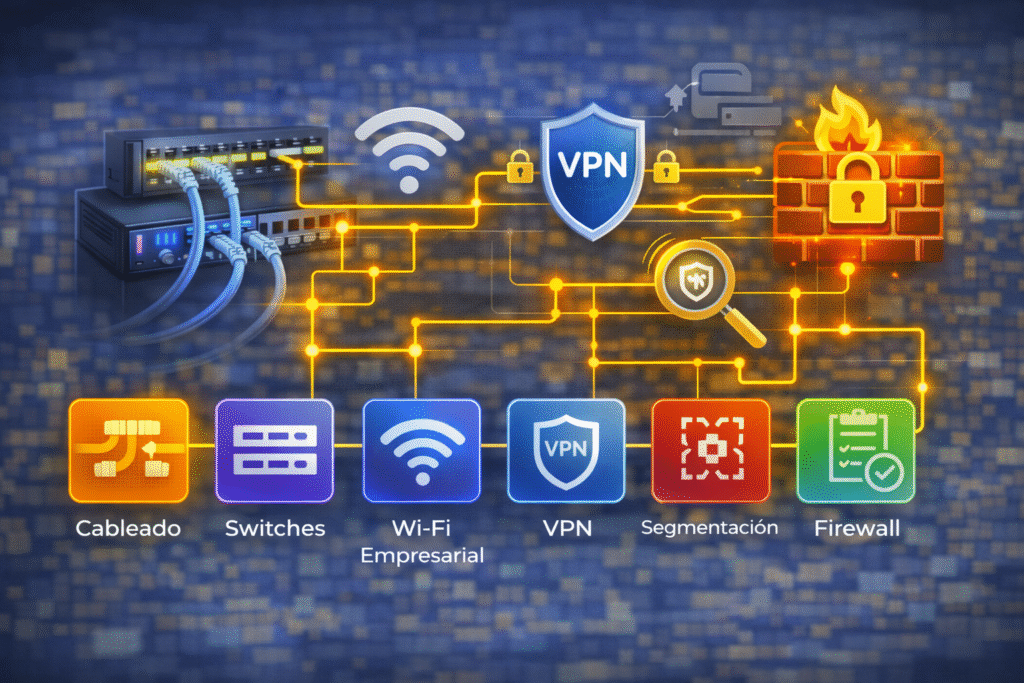 Sí. Hacemos instalación, configuración y mantenimiento de redes (Wi-Fi empresarial, switches, cableado, VPN, segmentación) y CCTV (cámaras, NVR/DVR, accesos por usuario, visualización remota, respaldo/almacenamiento). También damos soporte preventivo para evitar caídas y asegurar continuidad.