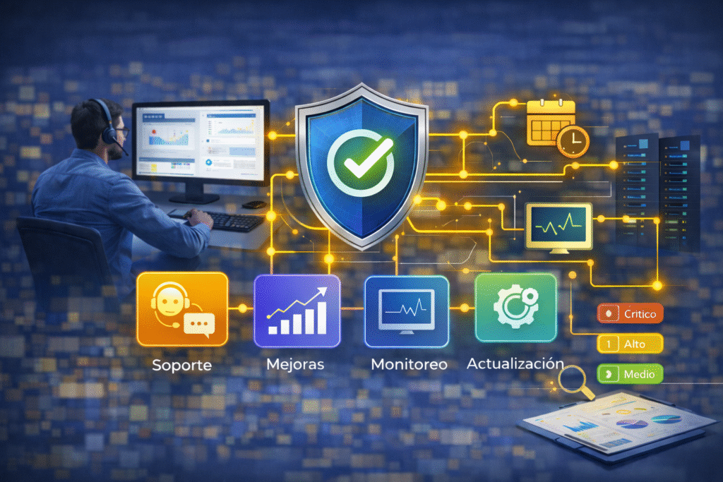 Sí. Contamos con pólizas que incluyen soporte, corrección de incidencias, mejoras evolutivas, monitoreo básico y actualizaciones programadas. Podemos trabajar con SLA por severidad (crítico/alto/medio), y opcionalmente agregar guardia fuera de horario, visitas on-site y reportes mensuales de desempeño/incidencias.
